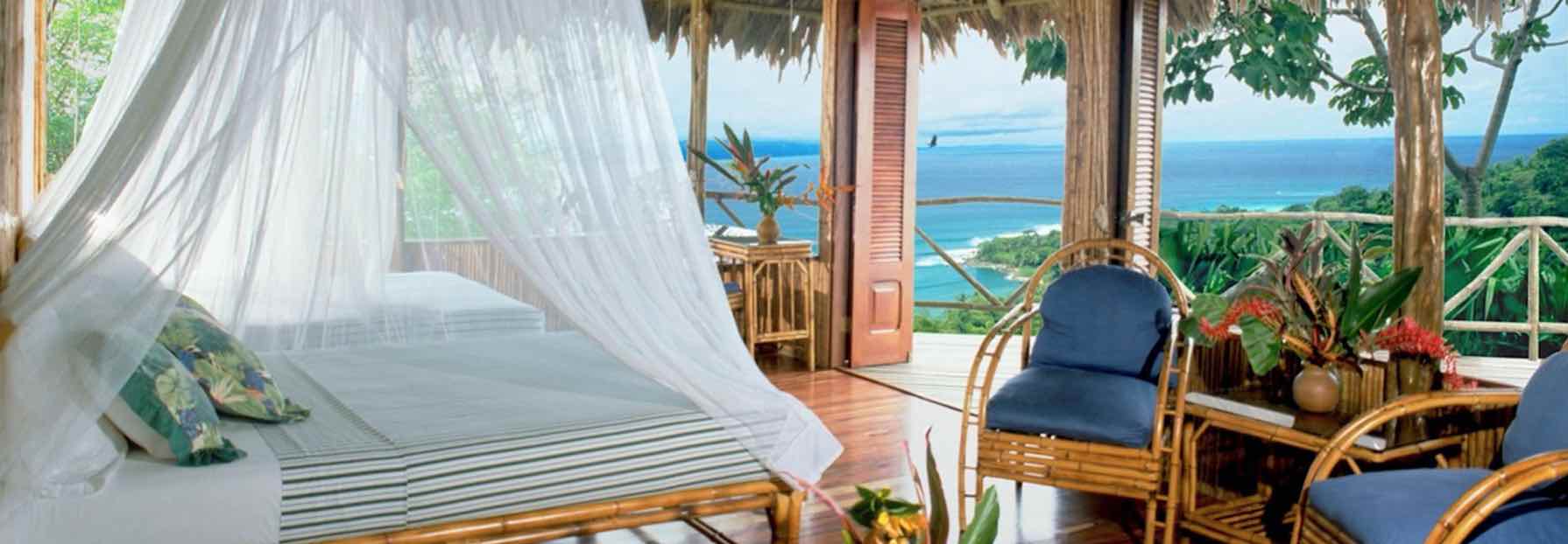 The reward at the top is unbeatable views and a cooling breeze. The thatched bungalows are built with wood and bamboo with open sides and screens to fully immerse guests in their jungle surroundings. All come with outdoor and indoor showers, tiled bathrooms, four poster beds, fantastic views and private terraces which are often visited by toucans, scarlet macaws, monkeys and other wildlife. Other facilities include direct access to three beaches, nature trails, a lovely swimming pool, gourmet cuisine created by trained chefs, a yoga deck, massages and daily guided excursions.